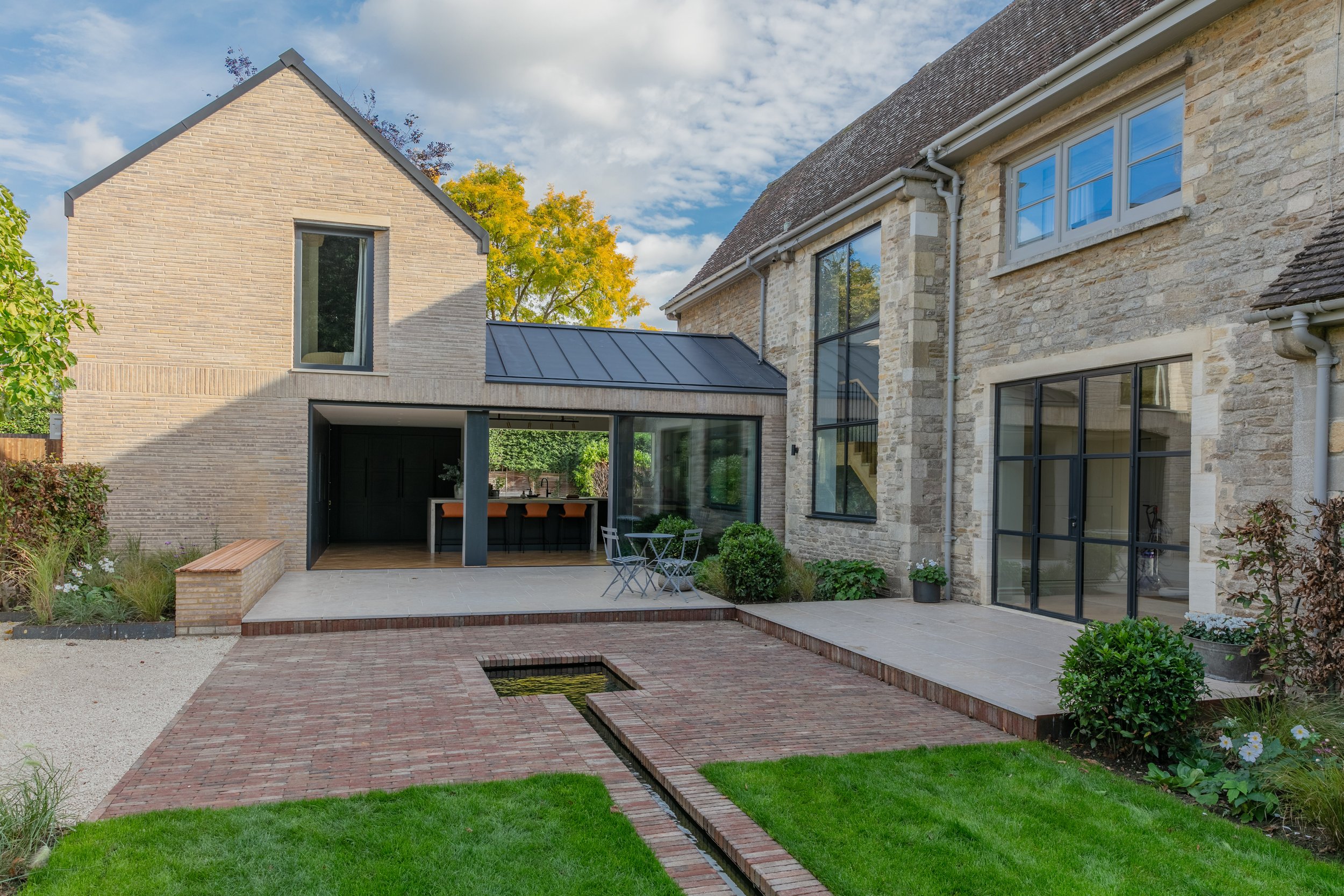 The brief for the garden was to create a new series of beautiful garden spaces which would help stitch together the new works on the house making the whole feel more legible. Key to this was to create a central entertaining space focused around the kitchen including a new rill + reflective pools.